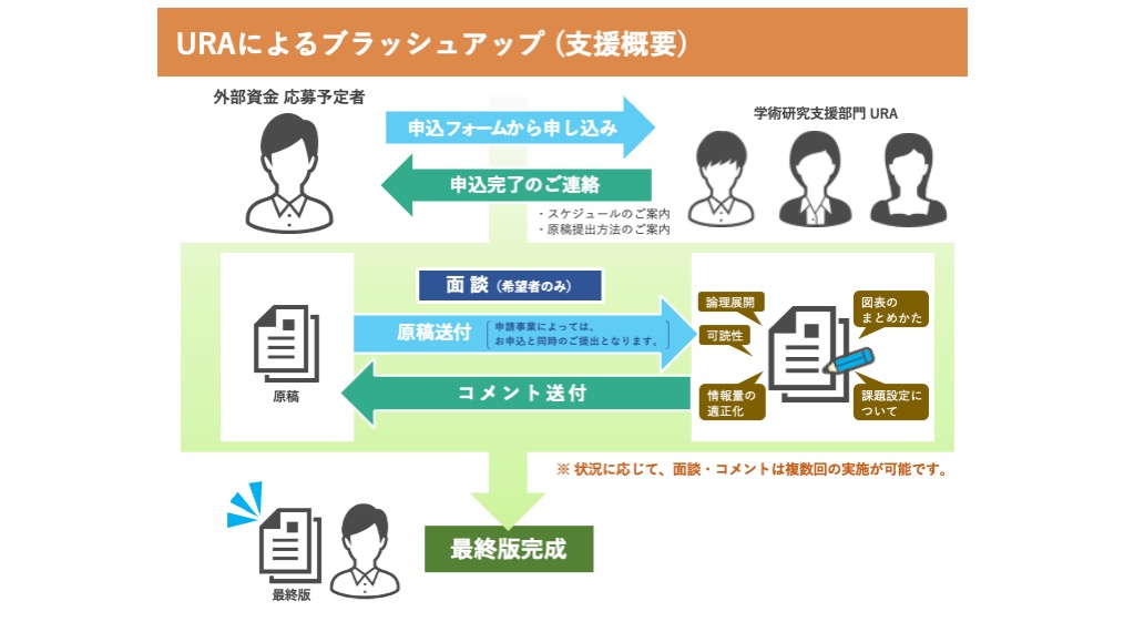 以下は昨年度の情報です。参考として掲載しています。・R8(2026)年度科研費 基盤研究(S) 調書ブラッシュアップ支援のお知らせ(2025/4/14)・URAによる科研費 基盤研究(C) 不採択調書レビュー支援のご案内(2025/5/27)・R8 (2026) 年度 科研費アドバイザーによる科研調書ブラッシュアップのご案内(2025/6/16)・URA による R8 (2026) 年度科研費調書ブラッシュアップのご案内(2025/6/16)・R8(2026)年度「学術変革領域研究(A)[公募研究]」申請支援のお知らせ(2025/7/24)
